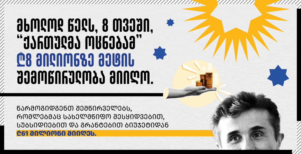 მხოლოდ წელს, 8 თვეში, “ქართულმა ოცნებამ” ₾8 მილიონზე მეტის შემოწირულობა მიიღო