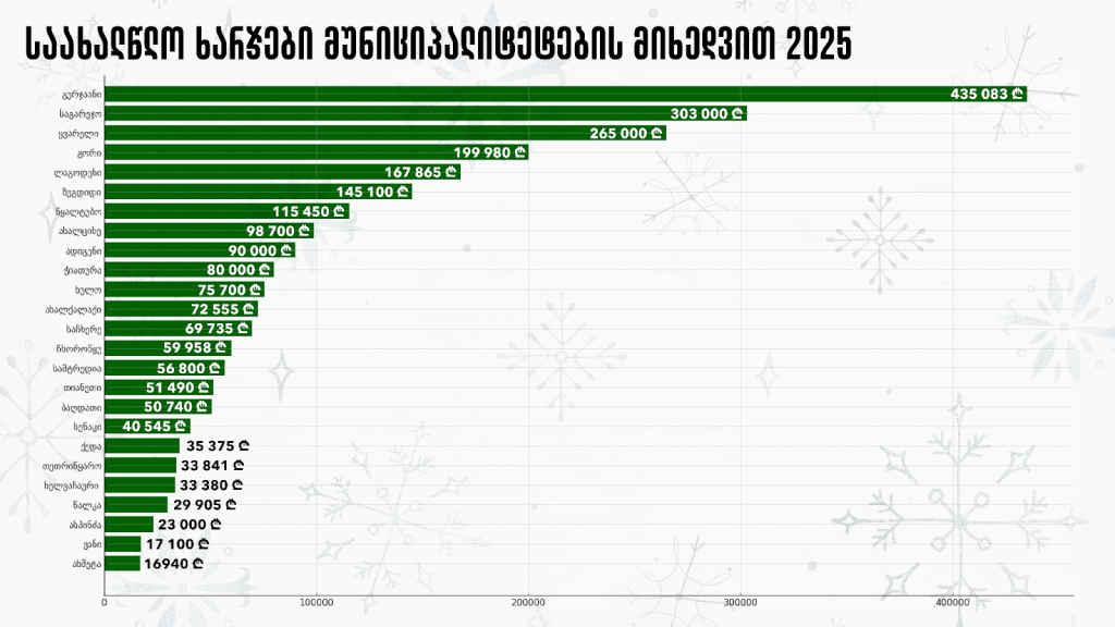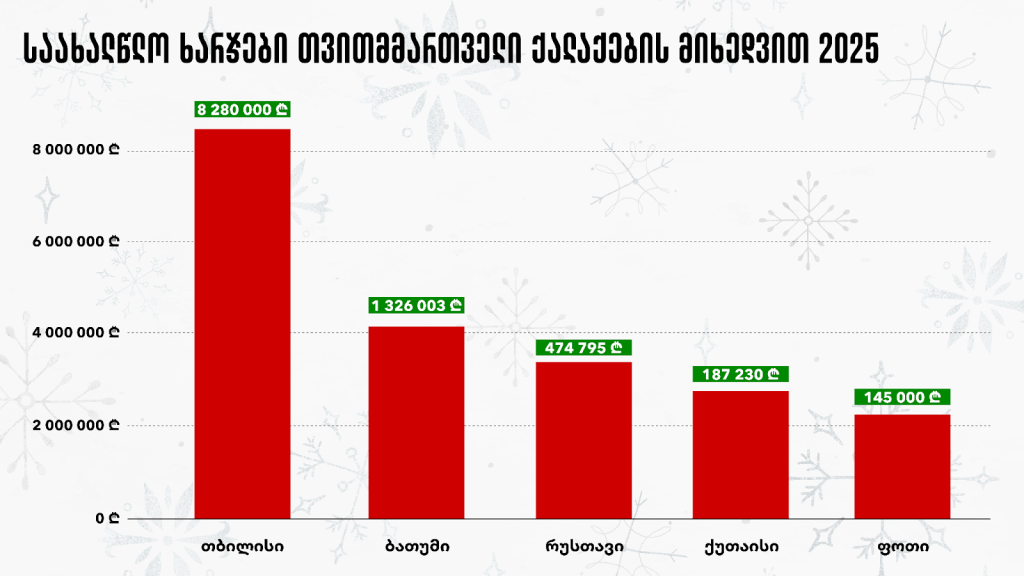 ქვეყანა პოლიტიკური კრიზისის ფონზე აგრძელებს ცხოვრებას, ხოლო ახალი წლისთვის მზადება ბიუჯეტისთვის ერთ-ერთ ყველაზე ძვირ ტრადიციად რჩება. საახალწლო დეკორაციებსა და ღონისძიებებზე 2025 წელს 12,5 მლნ ლარზე მეტი დაიხარჯება. ამ თანხიდან ყველაზე დიდი წილი თბილისზე მოდის, რომელმაც ამ მიზნისთვის ბიუჯეტიდან 8 მილიონ ლარზე მეტი გამოჰყო. მას მოსდევს ბათუმი 1,326 მლნ ლარით, ხოლო ჯამურად ხუთი თვითმმართველი ქალაქი საახალწლო მზადებაზე 10 მილიონ ლარზე მეტს ხარჯავს.