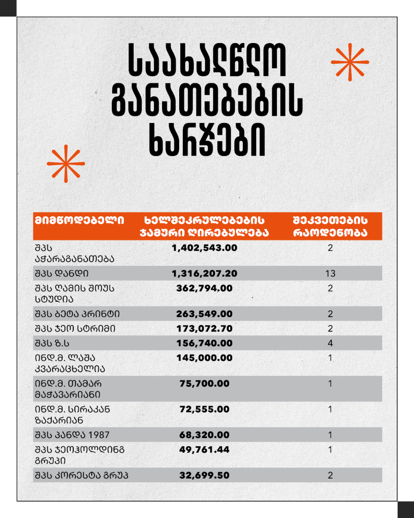 ყურადღებას იქცევს ისიც, რომ მერია ამ კომპანიებს ერთჯერადად კი არა, რამდენიმე ხელშეკრულებით აფინანსებს. მაგალითად, შპს „ქეი ივენთსსა“ და შპს „ვანილა ივენთს“ ოთხ-ოთხი კონტრაქტი აქვთ გაფორმებული, ხოლო შპს „ღამის შოუს სტუდიას“ – ხუთი. შედეგად, მხოლოდ ამ სამმა კომპანიამ 27 გამარტივებული კონტრაქტიდან 13 მიიღო და საერთო თანხის დაახლოებით ნახევარი აითვისა.