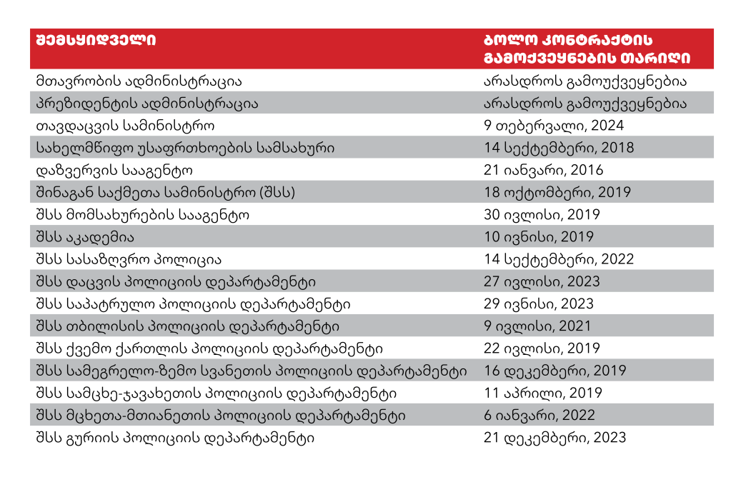 იმას, რომ ასეთი კონტრაქტები არსებობს, მაგრამ არ ქვეყნდება, სახელმწიფო შესყიდვების ელექტრონული სისტემის SMP მოდულიც ადასტურებს, სადაც სახელმწიფო უწყებების მიერ შესყიდვების სააგენტოსთან გამარტივებული შესყიდვის განხორციელებაზე თანხმობები ქვეყნდება. 2020-2025 წლებში შინაგან საქმეთა სამინისტრომ 597 შესყიდვაზე მოითხოვა გამარტივებული გზით განხორციელების უფლება. აქედან, 18 შესყიდვის ღირებულება მილიონ ლარზე მეტი იყო. მთავრობის ადმინისტრაციამ 31 შესყიდვაზე მოითხოვა გამარტივებული გზით განხორციელების უფლება, პრეზიდენტის ადმინისტრაციამ 15-ზე, სახელმწიფო უსაფრთხოების სამსახურმა 54-ზე და ა.შ. შემსყიდველებს ყოველთვის არ სჭირდებათ ნებართვა სახელმწიფო შესყიდვების სააგენტოსგან, მაგალითად, თუ 10,000 ლარამდე საქონელს ან 20,000 ლარამდე მომსახურებას ყიდულობენ.